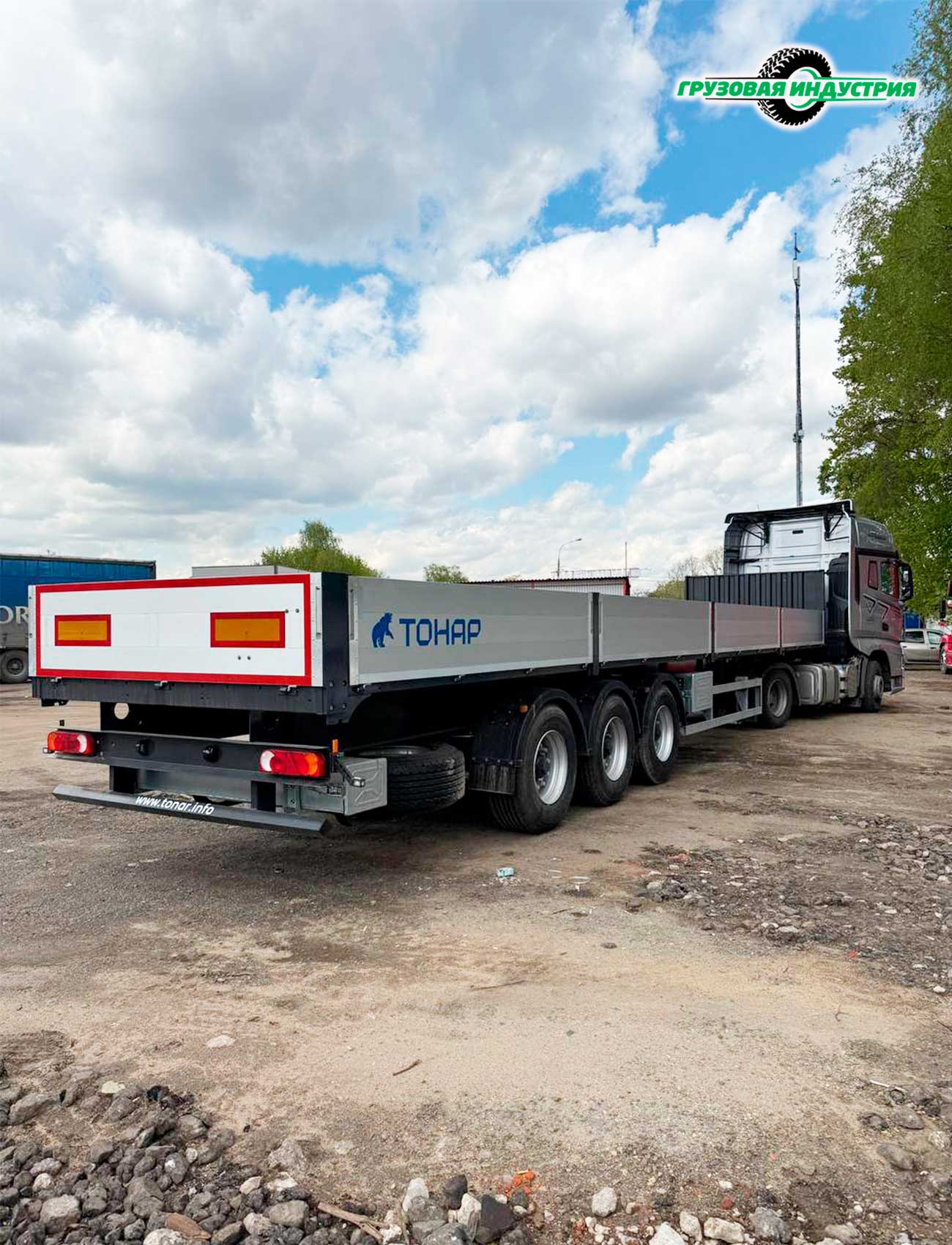 Отгрузка сцепки тягач FAW J7 4x2 и полуприцепа бортовая платформа Тонар B3-13K в Москву 7 мая 2025г.